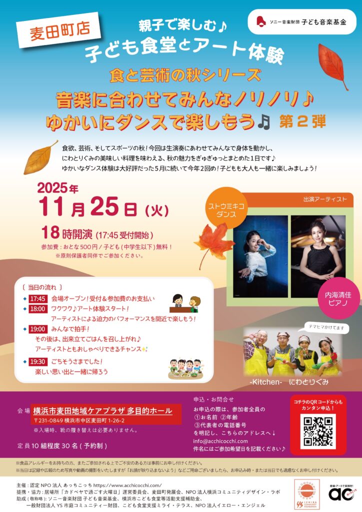 食欲の秋🍂芸術の秋🎨その2つの魅力を1日で存分に味わい尽くせてしまうのが、この子ども食堂とアート体験でございます!今回は5月公演でも大賑わいを見せた、みんなノリノリ🎵ダンスのアート体験の今季第2弾👏生演奏に合わせてたくさん身体を動かせるので、スポーツの秋!の要素も入るかな☺️