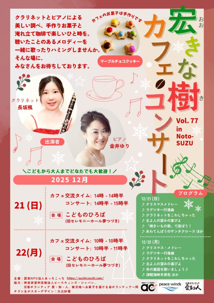 12/21-22 能登半島地震復興支援 – 宏きな樹カフェ・コンサート Vol.77 @珠洲市内こどもの広場(旧セレモニーホール夢つづき)